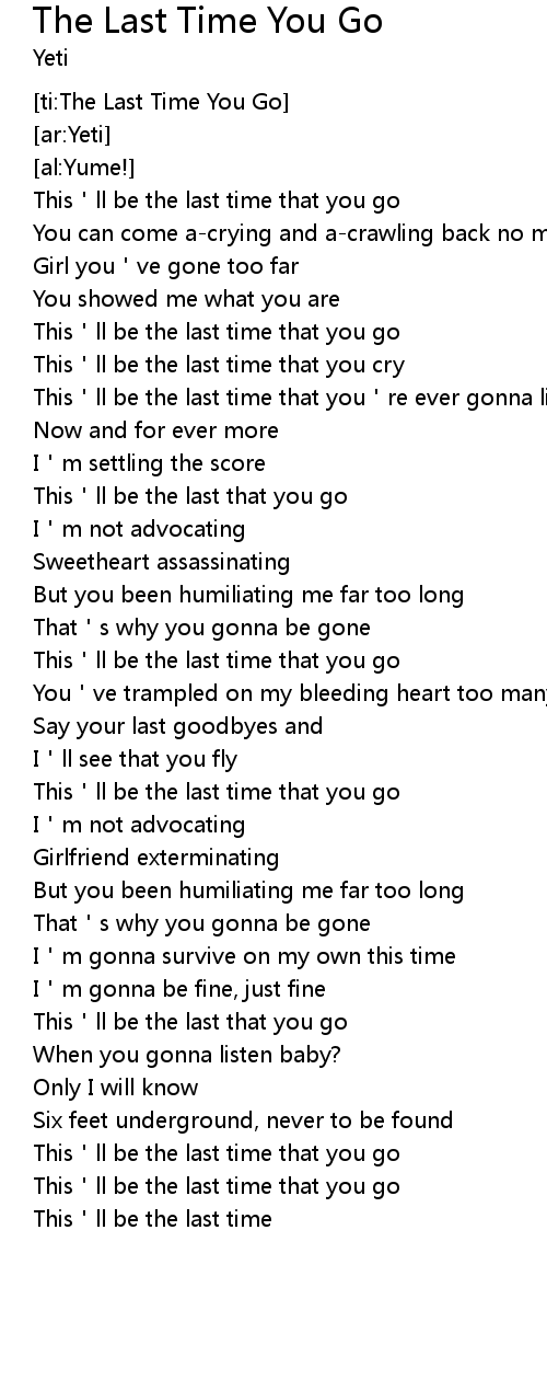 | [00:30.23] | This'll be the last time that you're ever gonna lie |