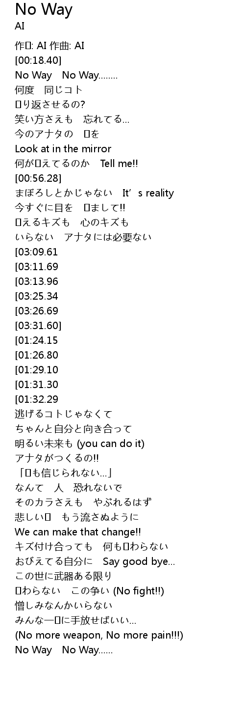 | [03:21.17][03:11.69][02:13.59][01:17.64] | No Way chū |