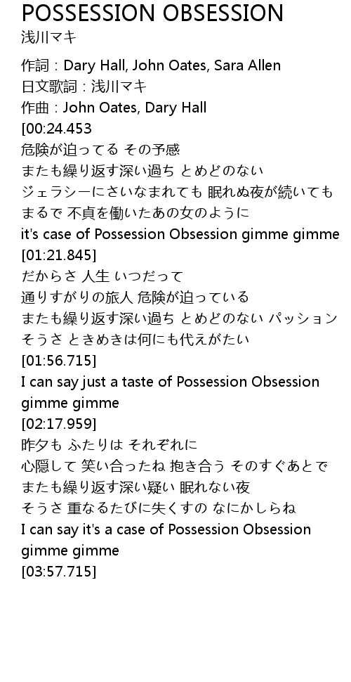 | [01:04.836] | it's case of Possession Obsession gimme gimme |