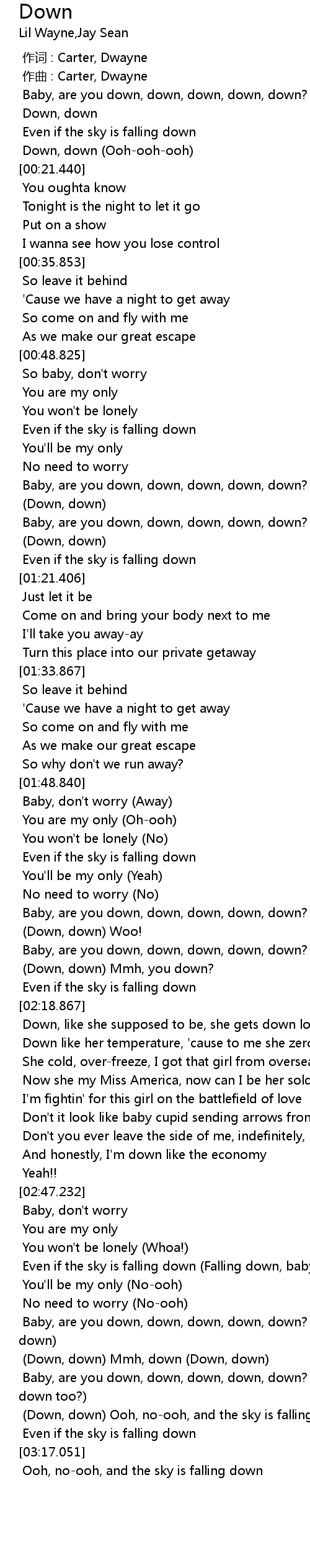 | [02:59.774] | Baby, are you down, down, down, down, down? (And the sky is falling down) |