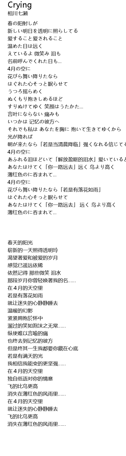 | [03:44.290] | 花びら舞い降りたなら「若是有落花如雨」 はぐれた心そっと眠らせて |