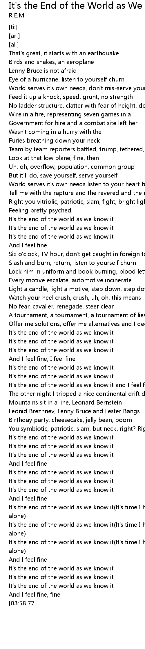 | [02:06.54] | It's the end of the world as we know it and I feel fine |