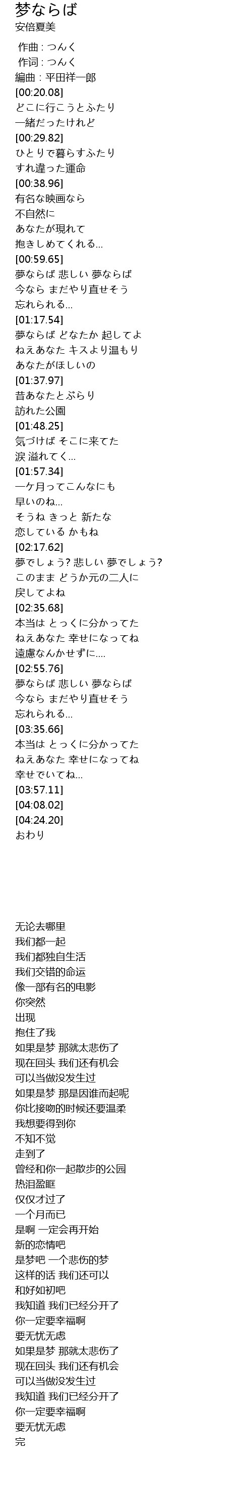 | [02:18.95] | 夢でしょう? 悲しい 夢でしょう? |