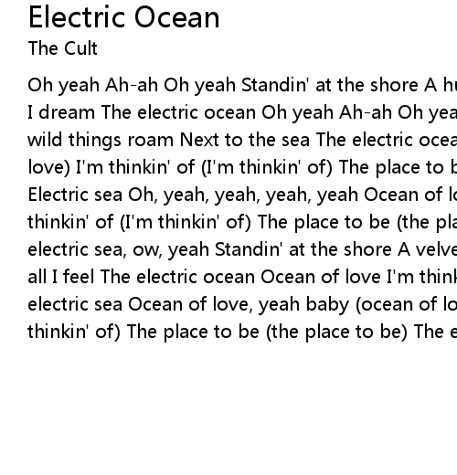 Oh yeah Ah-ah Oh yeah Standin' at the shore A hurricane calls my name Beyond all I dream The electric ocean Oh yeah Ah-ah Oh yeah The spirit is free Where the wild things roam Next to the sea The electric ocean Ocean of love (ocean of love) I'm thinkin' of (I'm thinkin' of) The place to be (the place to be) Electric sea Oh, yeah, yeah, yeah, yeah Ocean of love (ocean of love) I'm thinkin' of (I'm thinkin' of) The place to be (the place to be) Electric, electric sea, ow, yeah Standin' at the shore A velvet song calls my name Beyond all I feel The electric ocean Ocean of love I'm thinkin' of The place to be The electric sea Ocean of love, yeah baby (ocean of love) I'm thinkin' of (I'm thinkin' of) The place to be (the place to be) The electric, the electric sea