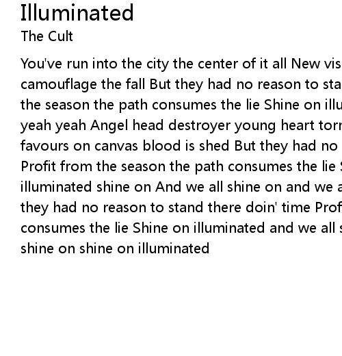 You've run into the city the center of it all New vision and new language to camouflage the fall But they had no reason to stand there doin' time Profit from the season the path consumes the lie Shine on illuminated shine on illuminated yeah yeah Angel head destroyer young heart torn to shreds You savage violent favours on canvas blood is shed But they had no reason to stand there doin' time Profit from the season the path consumes the lie Shine on illuminated shine on illuminated shine on And we all shine on and we all shine on illuminated But they had no reason to stand there doin' time Profit from the season the path consumes the lie Shine on illuminated and we all shine on illuminated Shine on shine on shine on illuminated |