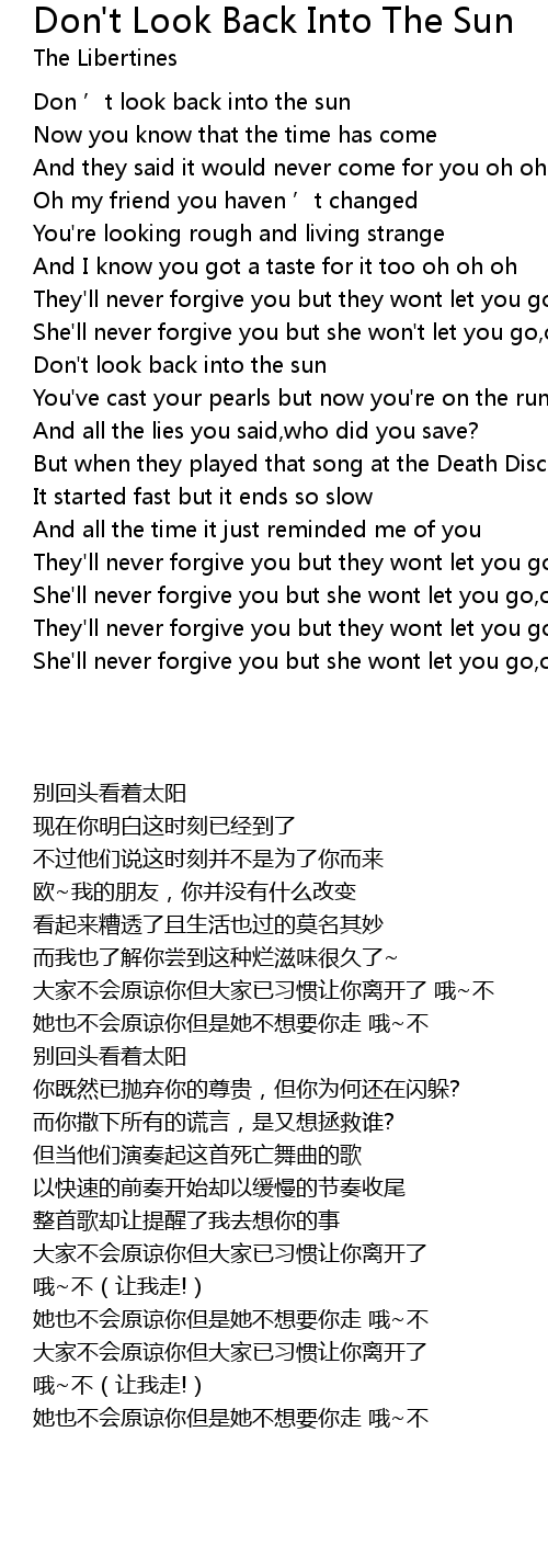 | [01:02.438] | They' ll never forgive you but they wont let you go, oh no |