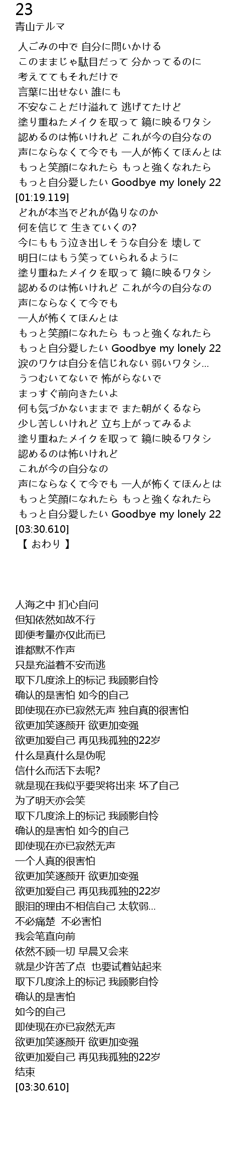 | [03:25.460] | もっと自分愛したい Goodbye my lonely 22 |