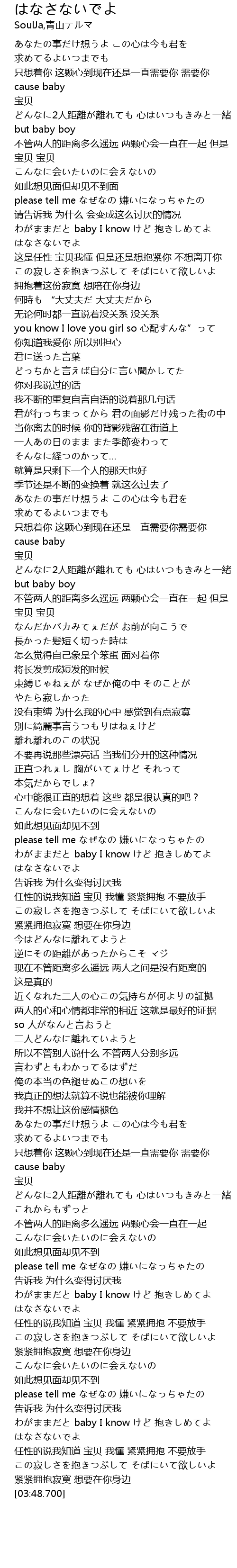 | [00:16.370] | どんなに2人距離が離れても 心はいつもきみと一緒 but baby boy |