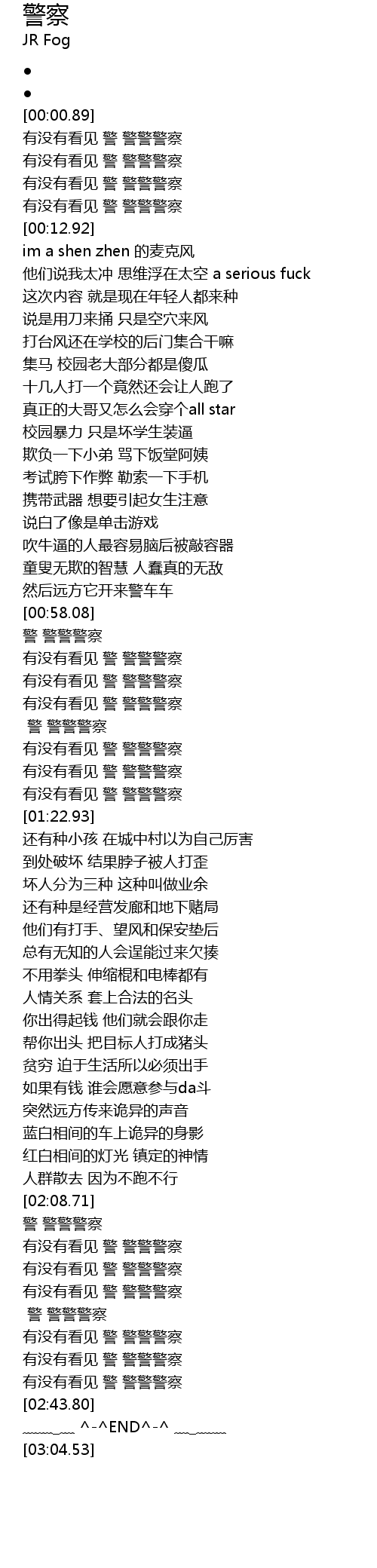 | [02:25.59] | 有没有看见 警 警警警察 |