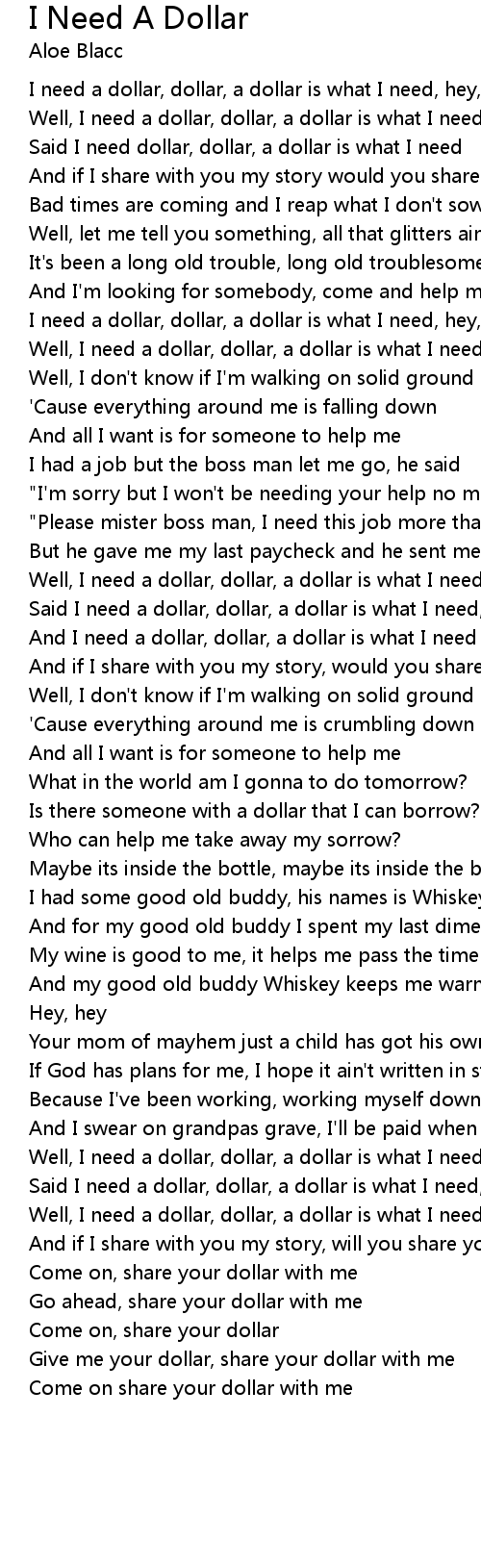 I need a dollar, dollar, a dollar is what I need, hey, hey |