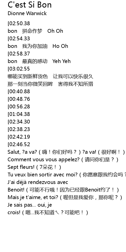 | [03:30.35][02:58.37][01:36.40][00:16.50] | C' est si C' est si bon zuì zhēn de gǎn dòng Yeh Yeh |