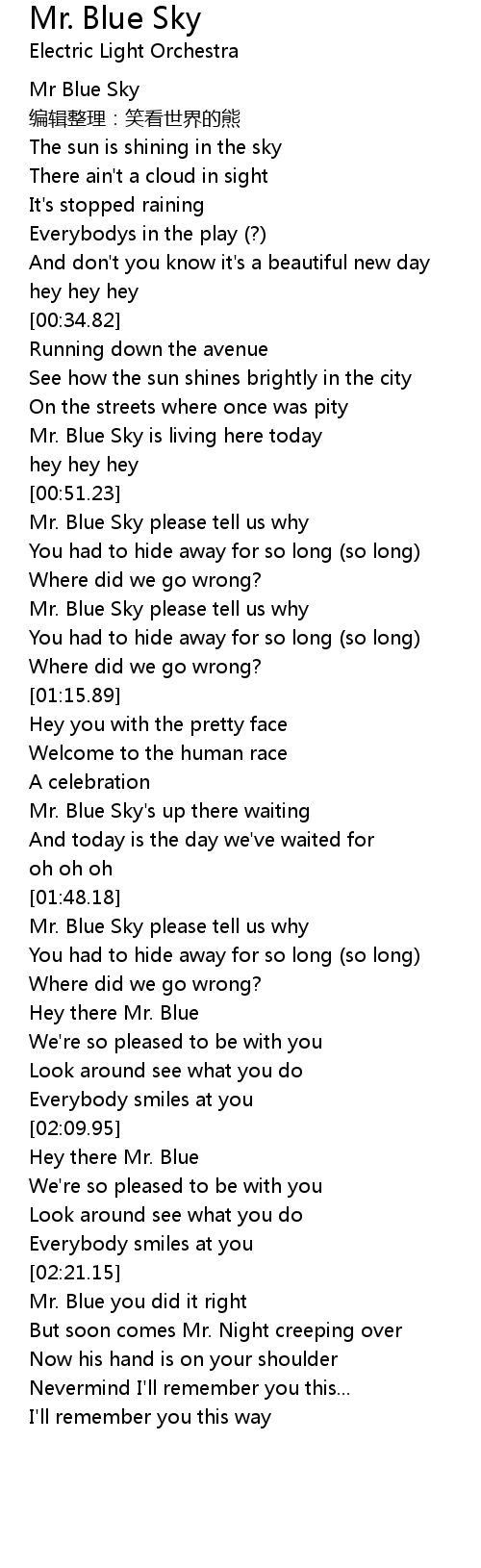 | [00:52.82] | Mr. Blue Sky please tell us why |