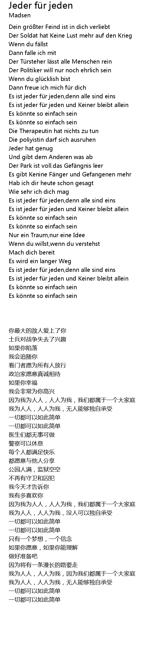 Jeder für jeden Jeder fü r jeden Lyrics