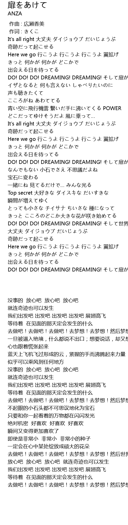 | [02:11.059] | DO! DO! DO! DREAMING! DREAMING! そして扉がひらくよ… |