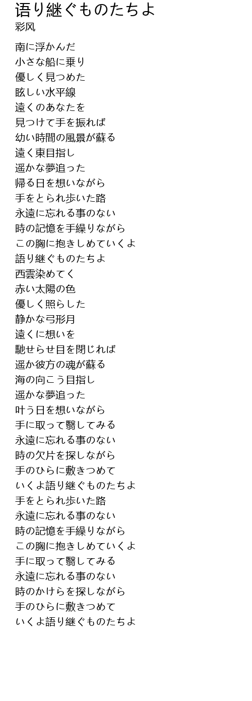 | [03:45.96] | いくよ語り継ぐものたちよ |