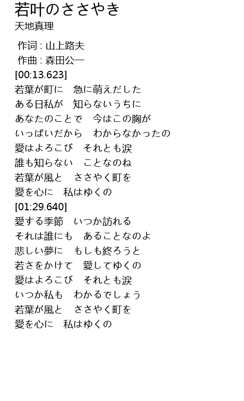 | [00:21.617] | 若葉が町に 急に萌えだした |