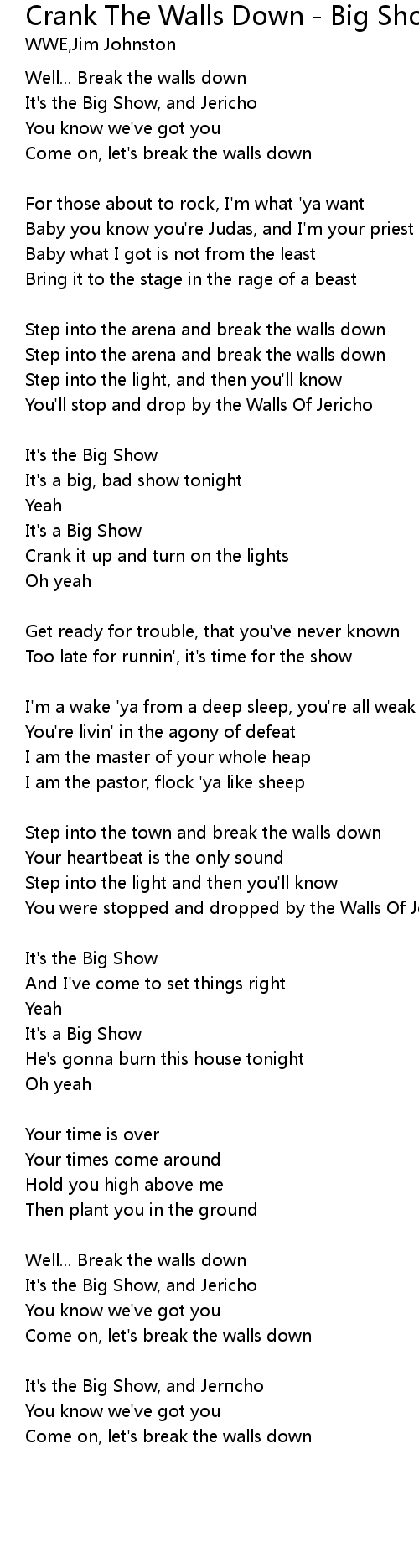 | Song | Crank The Walls Down - Big Show & Chris Jericho |