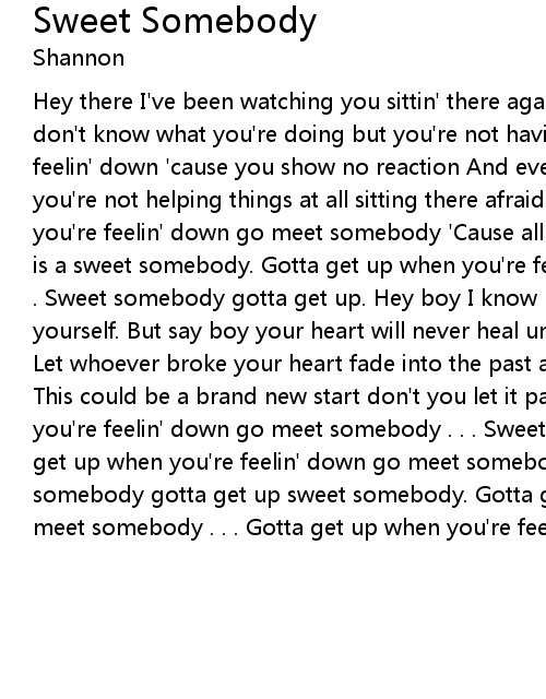 Hey there I've been watching you sittin' there against the wall. Say there I don't know what you're doing but you're not having fun at all. I can tell you're feelin' down 'cause you show no reaction And everybody's in the groove. But you're not helping things at all sitting there afraid to move. Gotta get up when you're feelin' down go meet somebody 'Cause all you need to turn things around is a sweet somebody. Gotta get up when you're feelin' down go meet somebody . . . Sweet somebody gotta get up. Hey boy I know how you feel sitting there all by yourself. But say boy your heart will never heal until you find somebody else. Let whoever broke your heart fade into the past and give tonight another try. This could be a brand new start don't you let it pass you by. Gotta get up when you're feelin' down go meet somebody . . . Sweet somebody gotta get up. Gotta get up when you're feelin' down go meet somebody . .. Gotta get up sweet somebody gotta get up sweet somebody. Gotta get up when you're feelin' down go meet somebody . . . Gotta get up when you're feelin' down go meet somebody . . . |