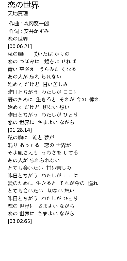 | [02:53.24] | 恋の 世界に さまよい ながら |
