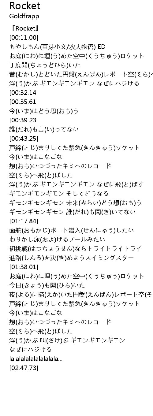 | [00:18.67] | お庭(にわ)に埋(う)めた空中(くうちゅう)ロケット |