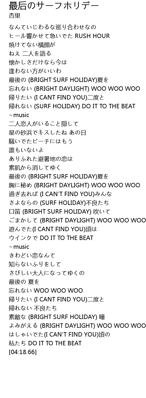 | [02:13.53] | 最後の (BRIGHT SURF HOLIDAY)夏を |
