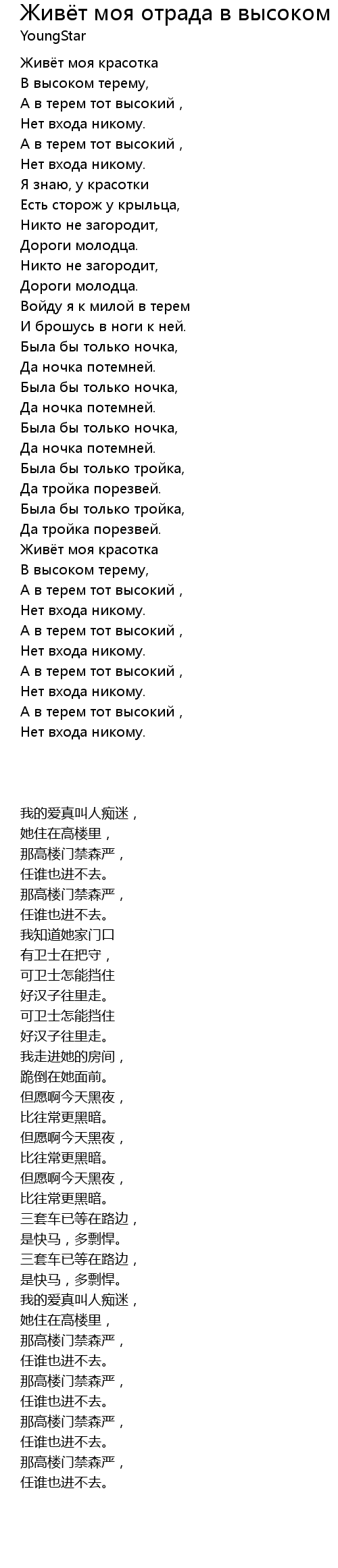 | Song | Живёт моя отрада в высоком терему |
