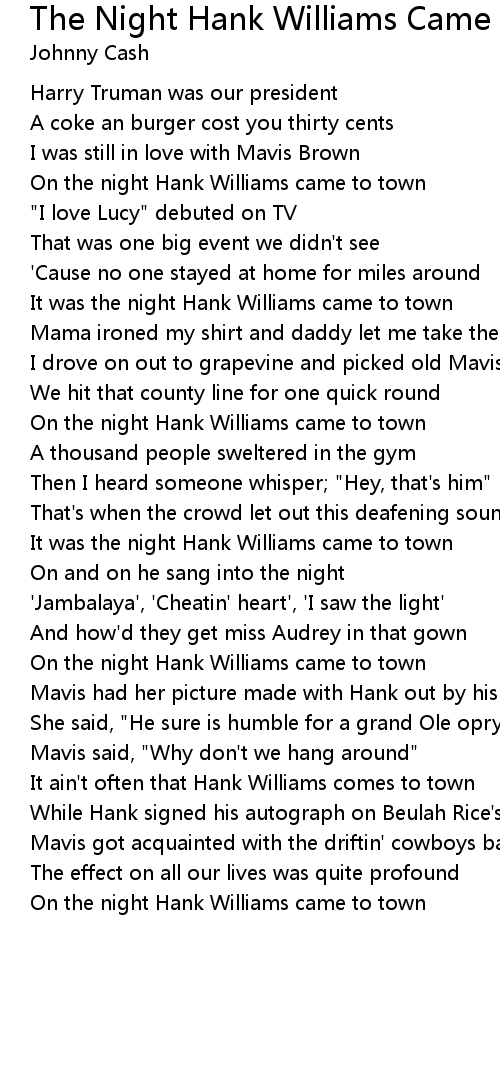 'Jambalaya', 'Cheatin' heart', 'I saw the light'
