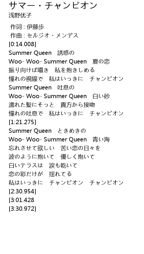 | [2:45.656][3:01.428][3:17.213] | Summer Queen Woo- Woo- Summer Queen |