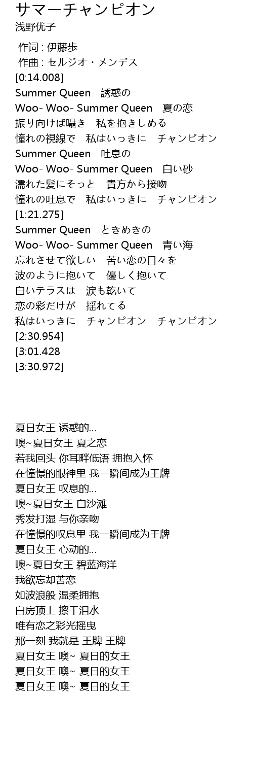 | [2:45.656][3:01.428][3:17.213] | Summer Queen Woo- Woo- Summer Queen |
