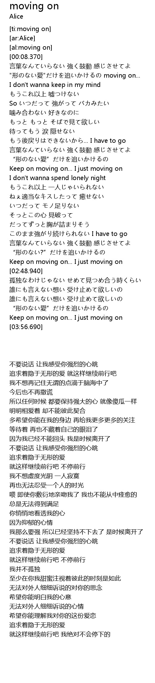| [00:20.600] | "形のない愛"だけを追いかけるの moving on... |