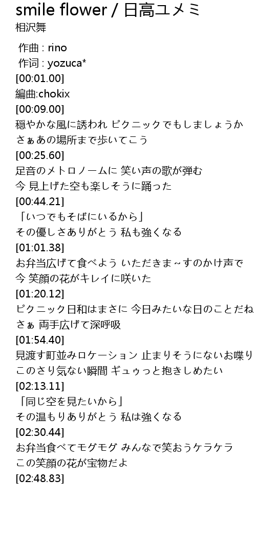 | [02:32.06] | お弁当食べてモグモグ みんなで笑おうケラケラ |