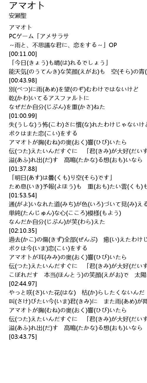 | [00:08.00] | PCゲーム「アメサラサ ~雨と、不思議な君に、恋をする~」OP |