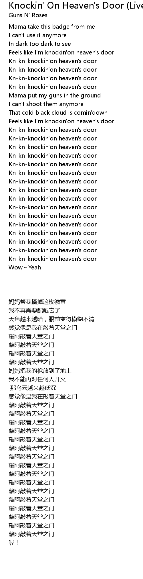 | [00:47.920] | Feels like I'm knockin'on heaven's door |