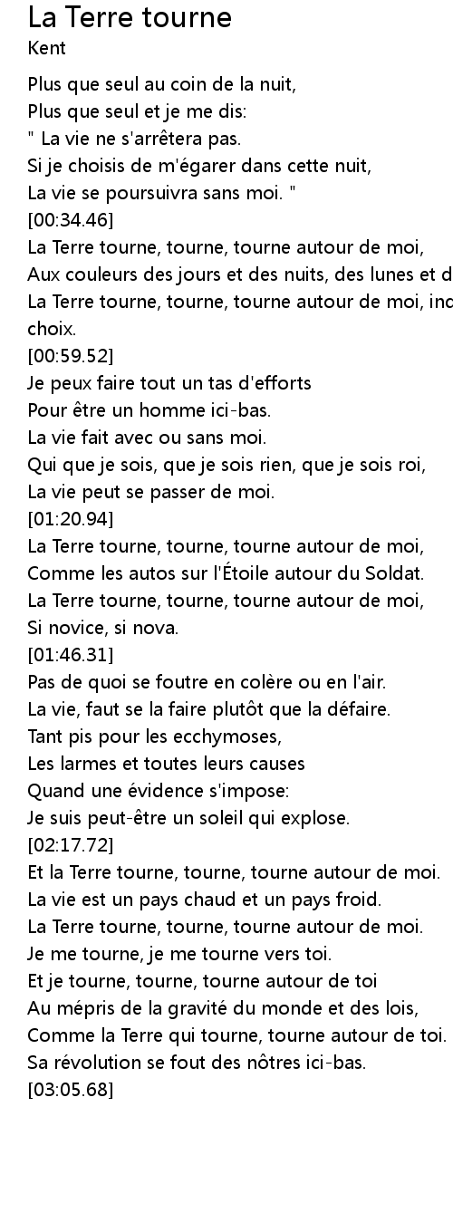 | [00:47.76] | La Terre tourne, tourne, tourne autour de moi, indifférente à mes choix. |