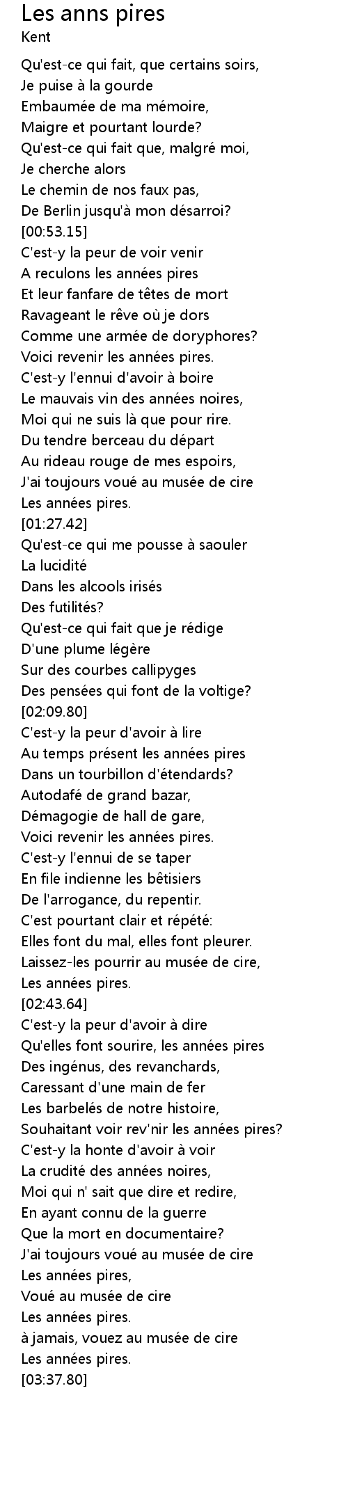 | [03:00.33] | Qu' elles font sourire, les anne es pires |