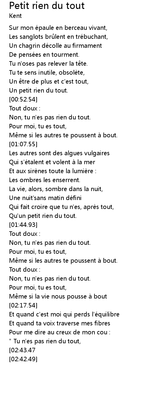 | [02:47.90][02:43.47][02:39.03] | Tu n' es pas rien du tout. " |