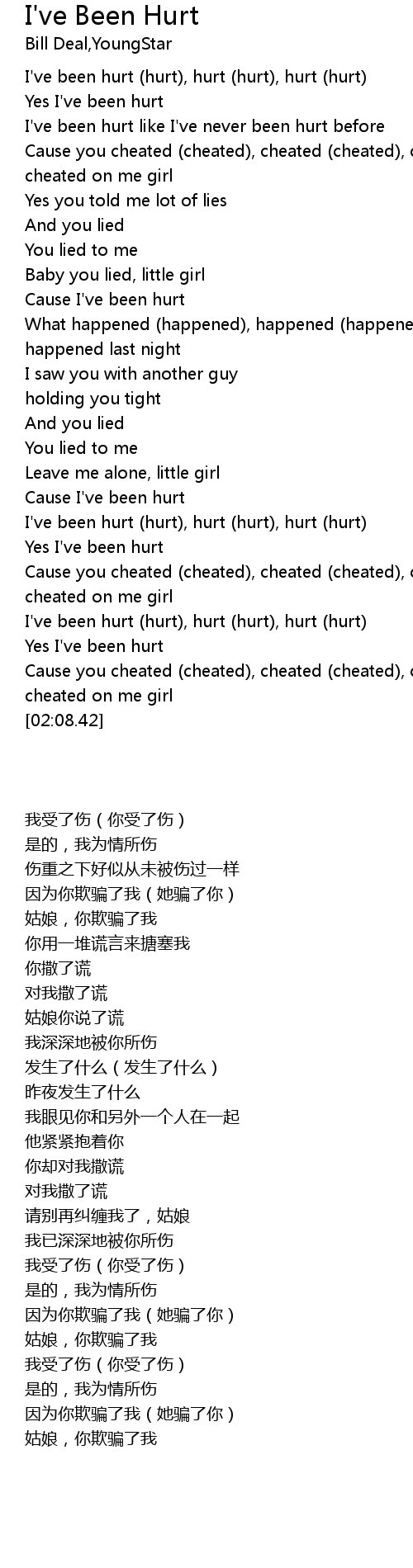 | [01:41.97] | I've been hurt (hurt), hurt (hurt), hurt (hurt) |
