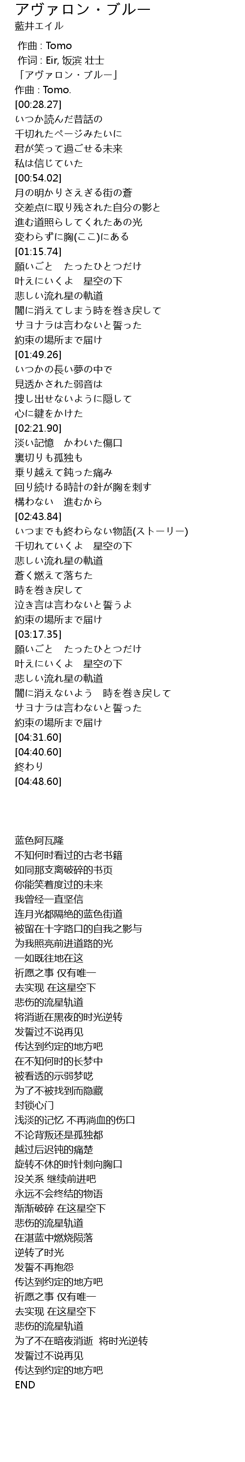 | [00:00.09] | 作词 : Eir, 饭滨 壮士 |