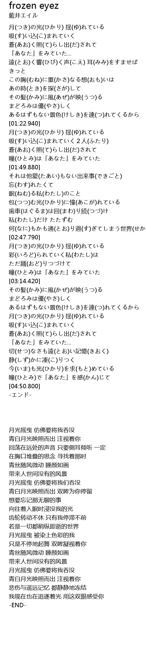 | [01:35.680] | 蒼(あお)く照(て)らし出(だ)されて 瞳(ひとみ)は「あなた」をみていた |