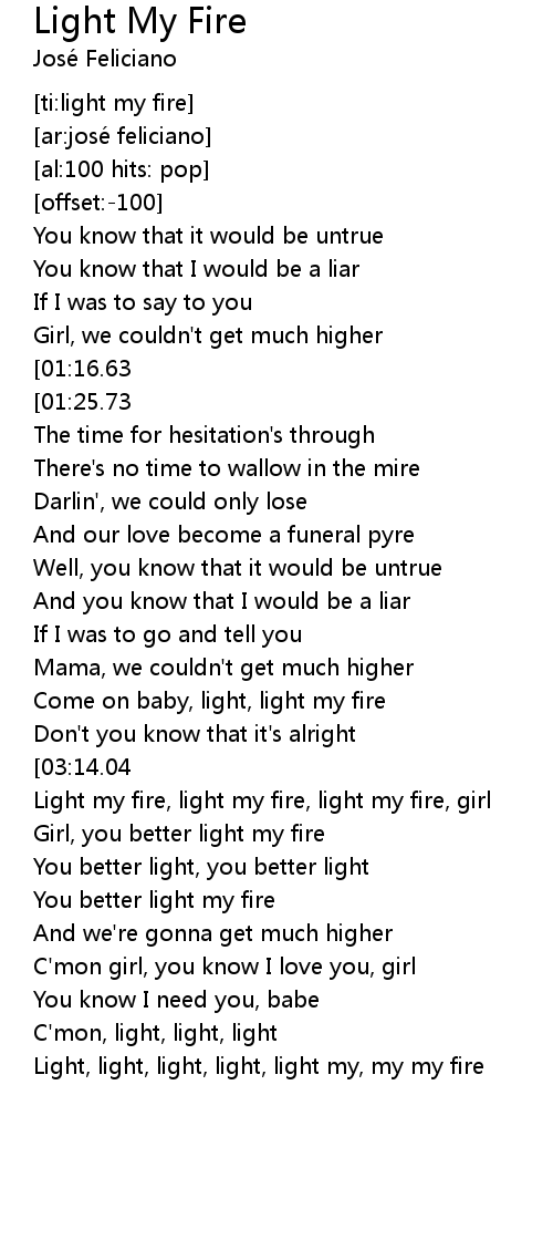 | [02:46.17][03:14.04] | Light my fire, light my fire, light my fire |