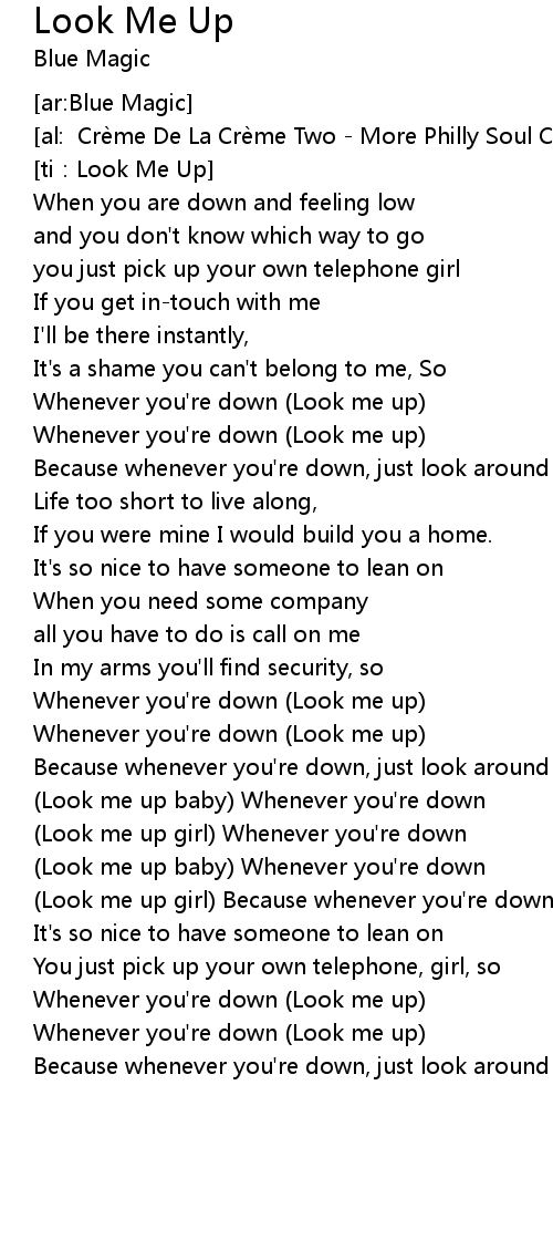 | [01:42.00] | Look me up baby Whenever you' re down |
