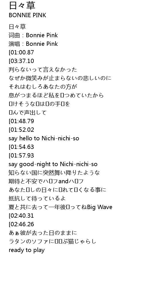 | [00:07.55][01:00.87][03:31.37] | Bonnie Pink rì cǎo |