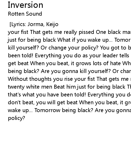 [Music: Mika, Rotten Sound] [Lyrics: Jorma, Keijo] Without thoughts you rise your fist That gets me really pissed One black man, twenty white men Beat him just for being black What if you wake up... Tomorrow being black? Are you gonna kill yourself? Or change your policy? You got to be bold, that's what you have been told! Everything you do as your leader tells If you don't beat, you will get beat When you beat, it grows lots of hate What if you wake up... Tomorrow being black? Are you gonna kill yourself? Or change the racial policy? Y(e)ah! Without thoughts you rise your fist That gets me really pissed One black man, twenty white men Beat him just for being black Thrash! You got to be bold, that's what you have been told! Everything you do as your leader tells If you don't beat, you will get beat When you beat, it grows lots of hate What if you wake up... Tomorrow being black? Are you gonna kill yourself? Or change your policy? |