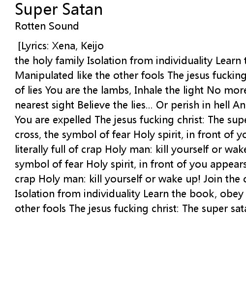 [Music: Mika, Rotten Sound] [Lyrics: Xena, Keijo] Uuuaah! Join the collective, the holy family Isolation from individuality Learn the book, obey the rules Manipulated like the other fools The jesus fucking christ: The super satan full of lies You are the lambs, Inhale the light No more free speech... In the nearest sight Believe the lies... Or perish in hell And from the heaven's gates You are expelled The jesus fucking christ: The super satan full of lies Holy cross, the symbol of fear Holy spirit, in front of you appears Holy book, literally full of crap Holy man: kill yourself or wake up! Holy cross, the symbol of fear Holy spirit, in front of you appears Holy book, literally full of crap Holy man: kill yourself or wake up! Join the collective, the holy family Isolation from individuality Learn the book, obey the rules Manipulated like the other fools The jesus fucking christ: The super satan full of lies |