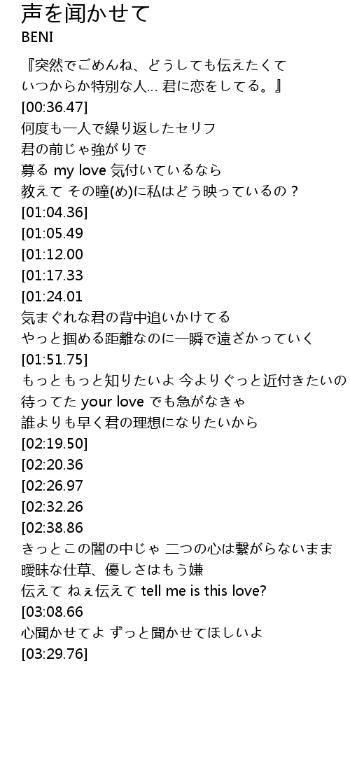 | [03:33.95][01:05.49] | 声を聞かせてよ もっと聞かせて欲しいよ |