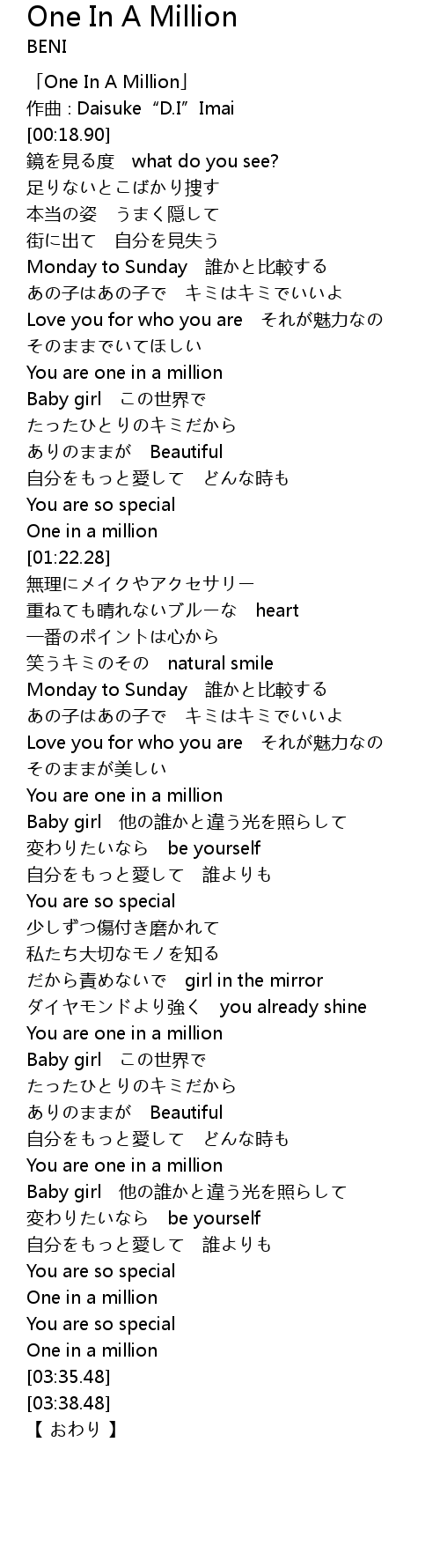 | [02:03.58] | Baby girl 他の誰かと違う光を照らして |