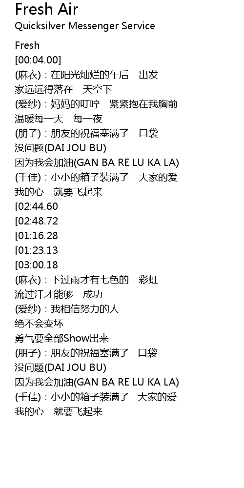 | [03:03.72][02:44.60][01:10.37] | he chang: Fresh Fresh Fresh wo de ming tian |