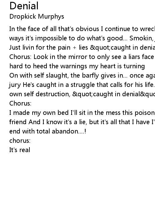 In the face of all that's obvious I continue to wreck my life... So set in my ways it's impossible to do what's good... Smokin, jokin + boozin my time away Just livin for the pain + lies "caught in denial".. |