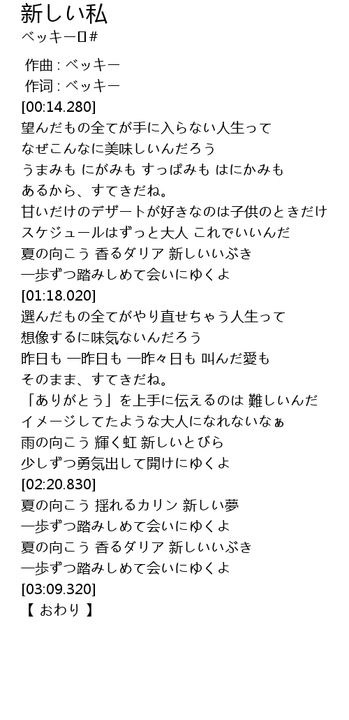 | [02:54.200] | 夏の向こう 香るダリア 新しいいぶき |
