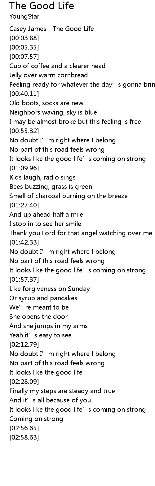 | [01:04.67] | It looks like the good life' s coming on strong |